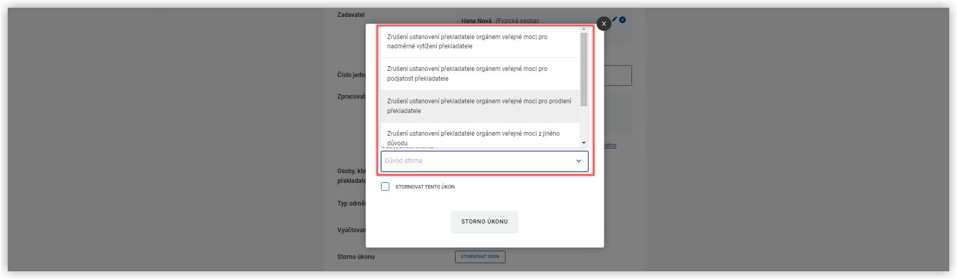 Zobrazí se okno Storno úkonu. Zvolte z nabídky odůvodnění storna.
