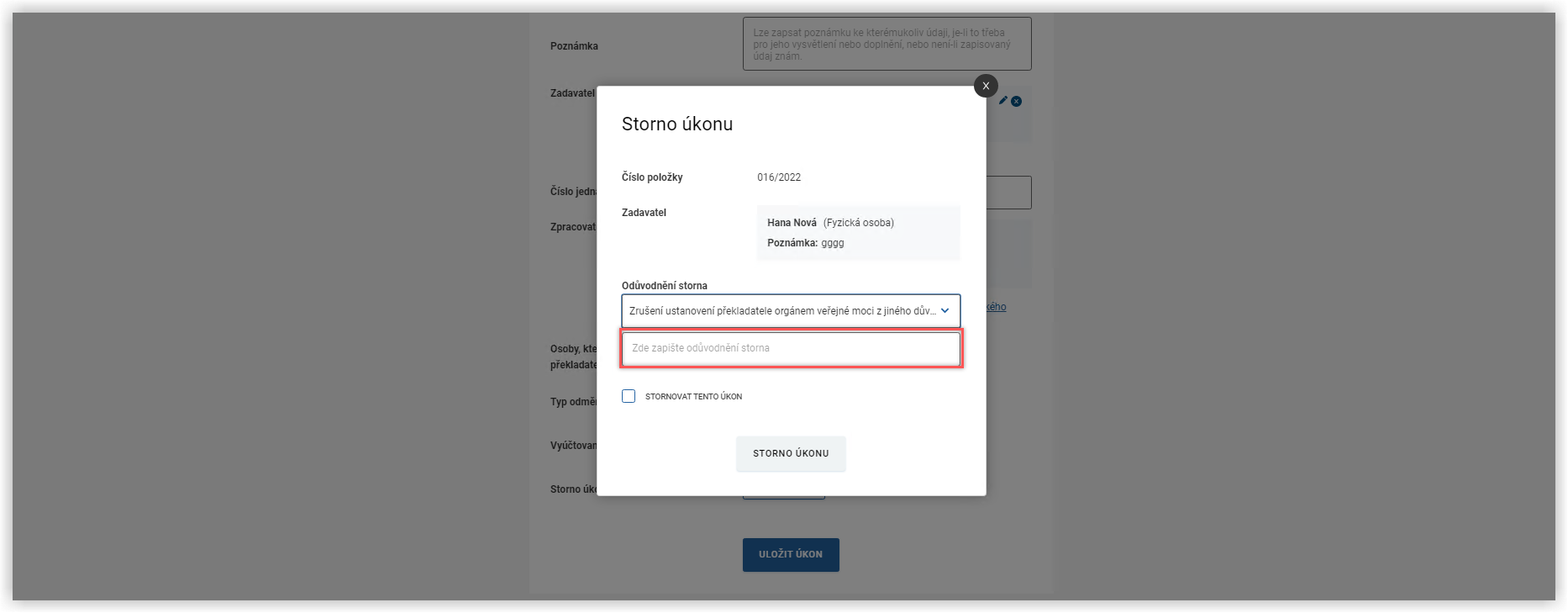 Pro důvody z kategorie jiných důvodů se zobrazí další pole. Zde vyplňte textem odůvodnění storna.