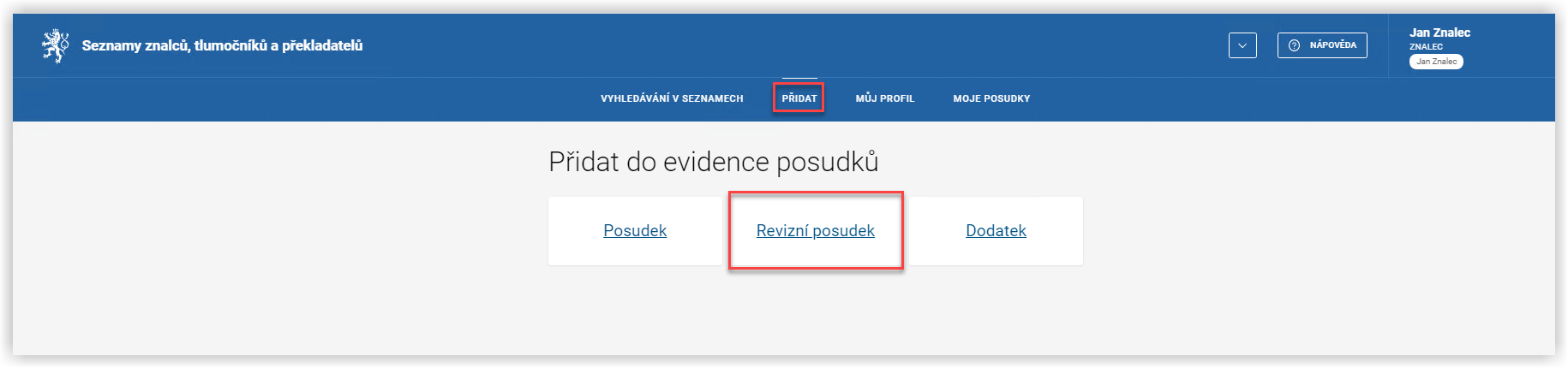 V horním horizontálním menu zvolte Přidat a možnost Revizní posudek.